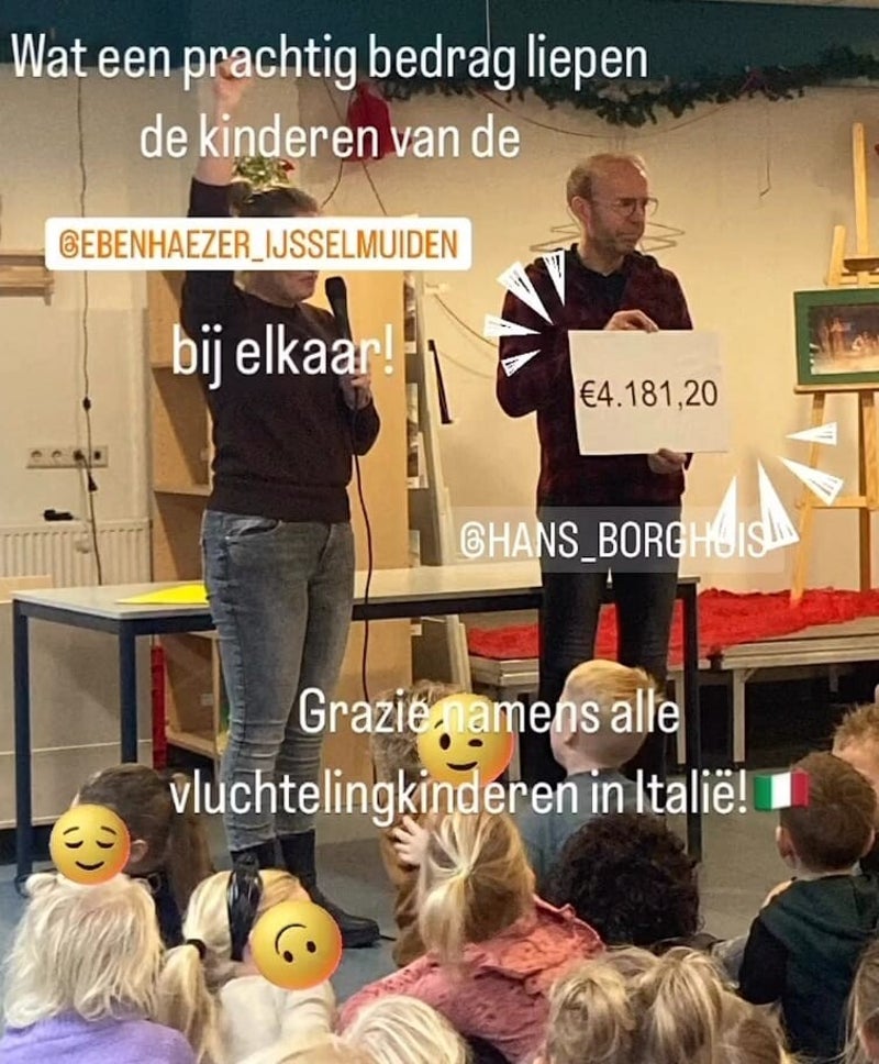 Wat een fantastisch resultaat! Dankzij de kinderen van de Eben-Haëzerschool én dankzij alle sponsoren mochten we afgelopen maandag een cheque van maar liefst €4.181,20 in ontvangst nemen. Een geweldig bedrag voor het werk onder vluchtelingkinderen in Italië. Mooi was het ook om te zien hoe de kinderen op 29 november vol enthousiasme hun best deden zoveel mogelijk rondjes te rennen voor hun leeftijdsgenootjes op de vlucht. Het resultaat is boven verwachting en hiervoor willen we zowel de kinderen alsook de sponsoren heel hartelijk bedanken. Het geld zal besteed worden om vluchtelingkinderen in Italië een onvergetelijke zomerweek te geven en hen in aanraking te brengen met de liefde van Jezus. Heel veel dank voor jullie hulp!